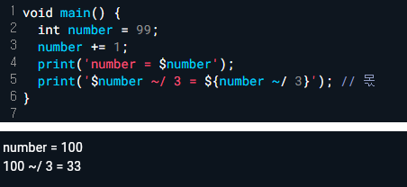 '~/' 연산자는 몫을 구하는 연산자로 100을 3으로 나눈 몫은 33이 된다.