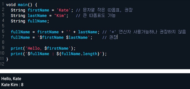 문자열은 큰 따옴표, 작은 따옴표 모두 사용할수 있지만 다트에서는 작은 따옴표를 권장한다.