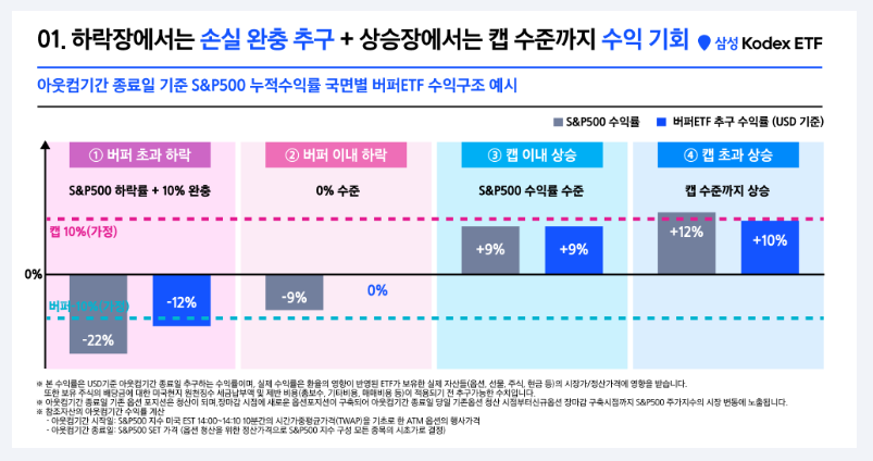 버퍼 ETF는 이익의 상한을 설정하고 하락을 일정 비율까지 보장하는 구조이다. 하방은 -10%까지 보장되며, 상방은 캡에 따라 수익이 제한된다.